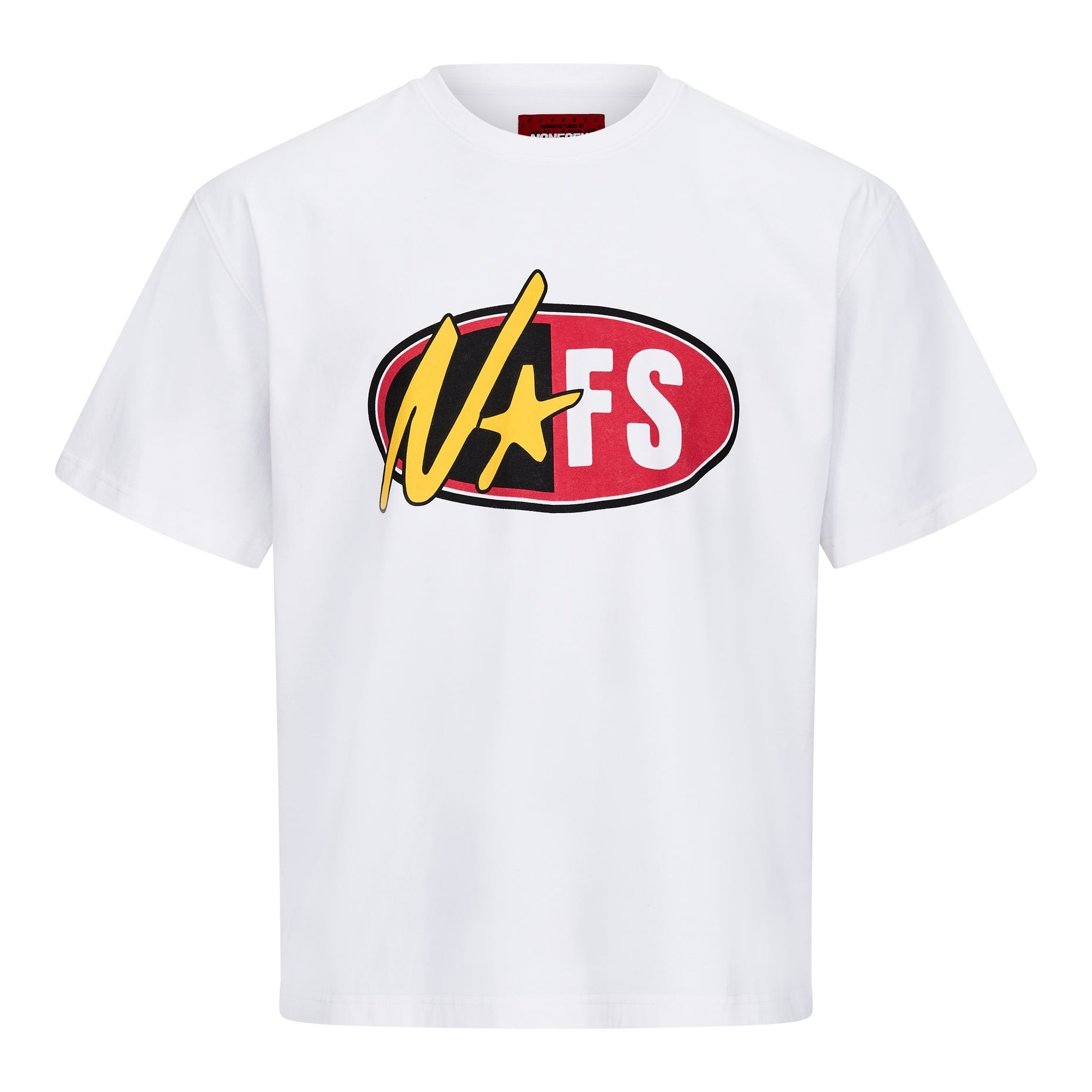 Weißes Baumwoll-T-Shirt mit geripptem Halsausschnitt, auf der Vorderseite aufgedruckten verschwommenen „N*fs“-Grafiken und sauberer Rückseite.